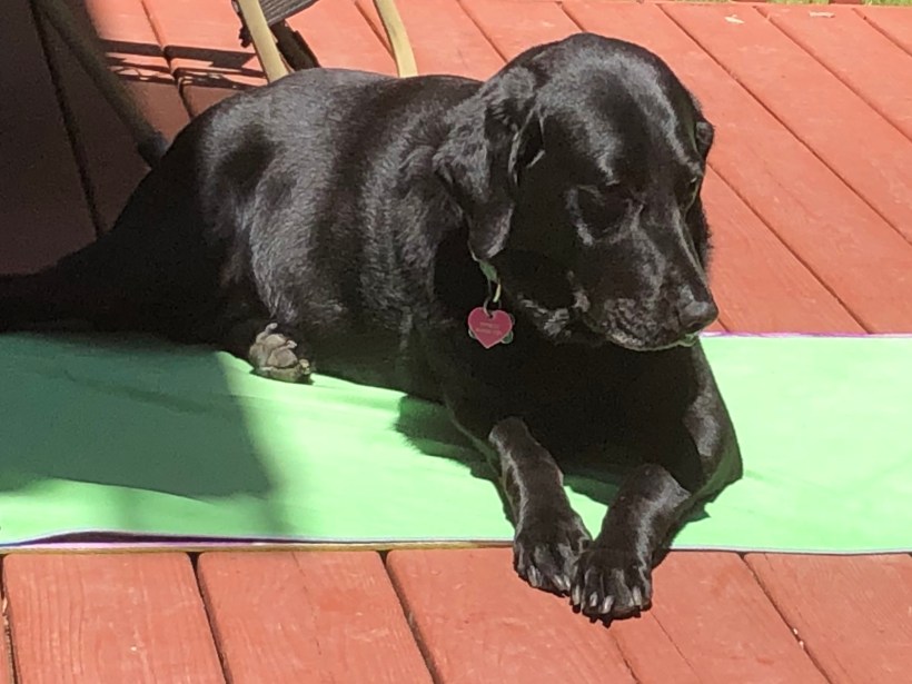 I washed my yoga mat, which I rarely did while my 100-lb Black Lab Phoenix filled my life. Before she died months ago, she determined the rolling out of my mat was meant for her, even if I tried to coax her onto her own yoga mat, gifted due to her nail scratches. She had to be on whichever mat I wanted to use. So, I mostly did yoga around her.
